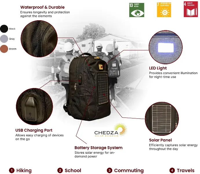 The Chedza Solar Backpack is a groundbreaking product designed for individuals on the go. Crafted from durable and waterproof canvas material, this innovative backpack is built to withstand the elements while providing unparalleled functionality.